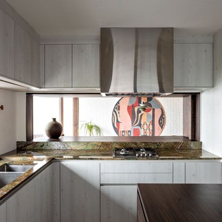 O piso de ardósia presente em algumas áreas do térreo foi substituído por um granilite claro, trazendo maior claridade ao espaço. É importante ressaltar a decisão de utilizar o granilite composto com seixos de rio (existentes da casa), pois era um material bastante utilizado na década de 1960, época em que a casa foi construída."