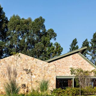 A colocação, a paginação e a seleção dos tijolos de demolição, reutilizados na obra com cores e tamanhos diversos, colabora com a aparência rústica da arquitetura. O mesmo vale para a pedra madeira que reveste as paredes, tendo-se privilegiado a escolha de peças com nuance amarelada, condizente com aquela predominante nos tijolos.